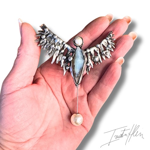 Materiál: cín, stříbro, surový akvamarín, říční perla, nerez