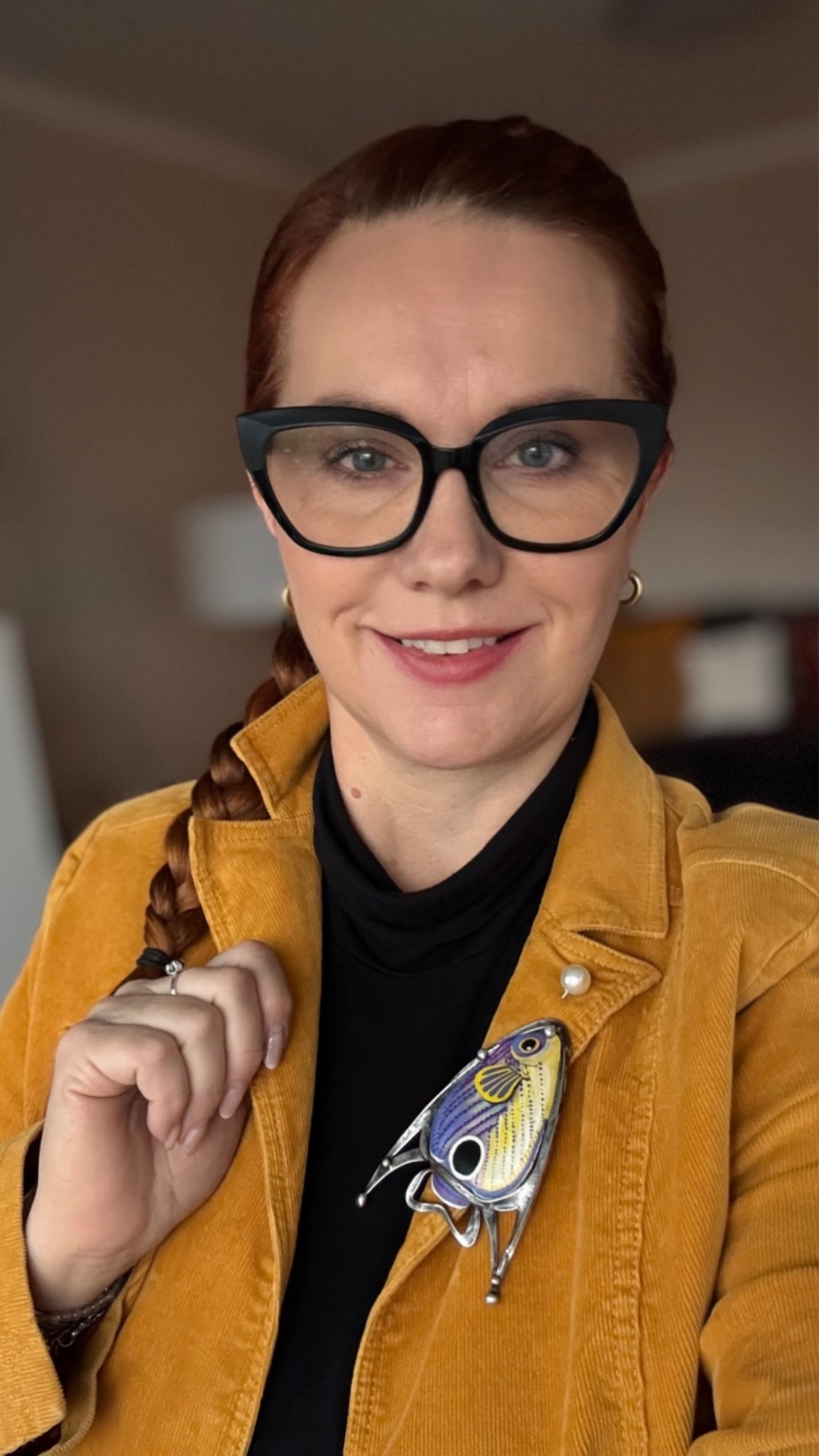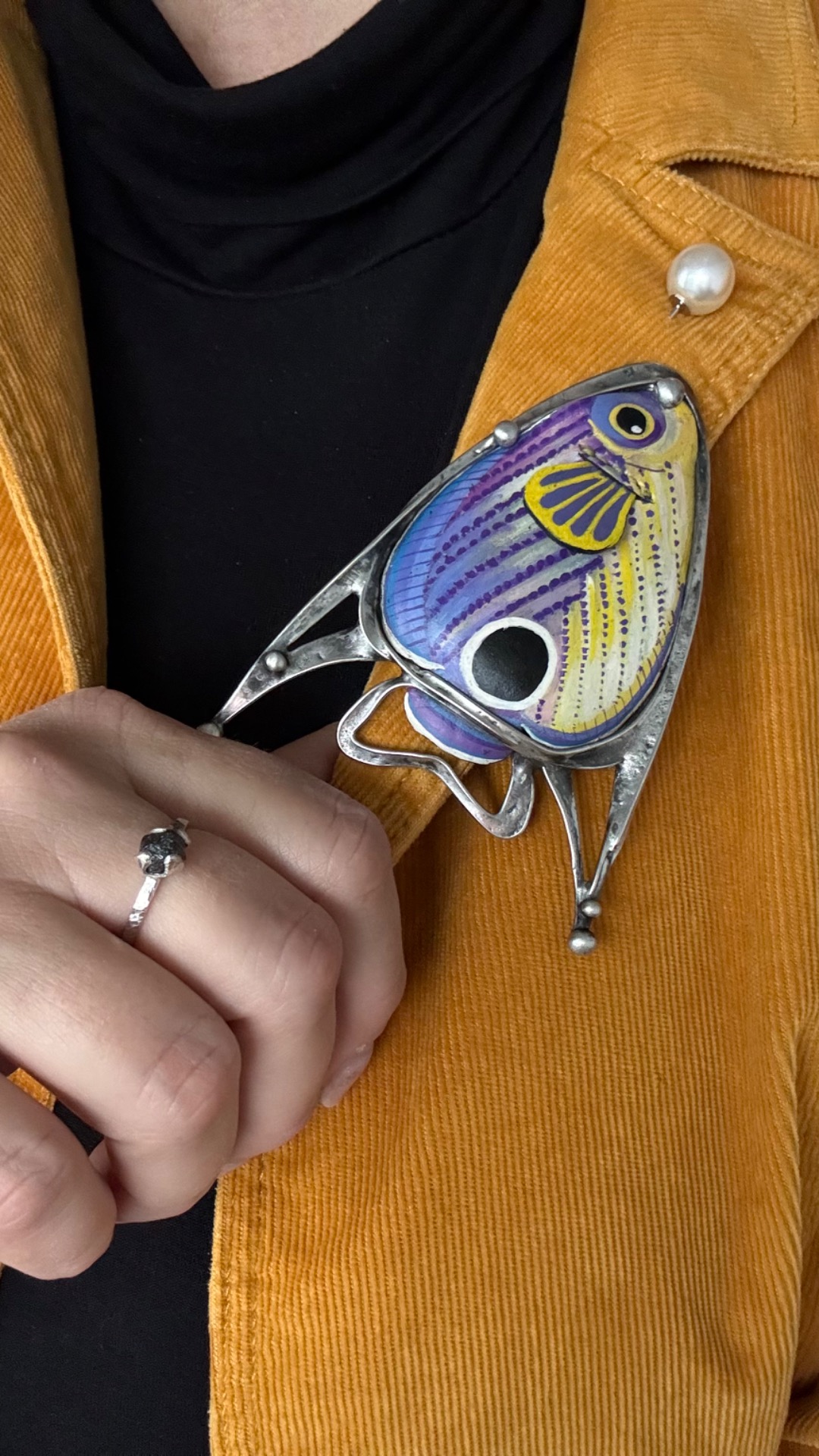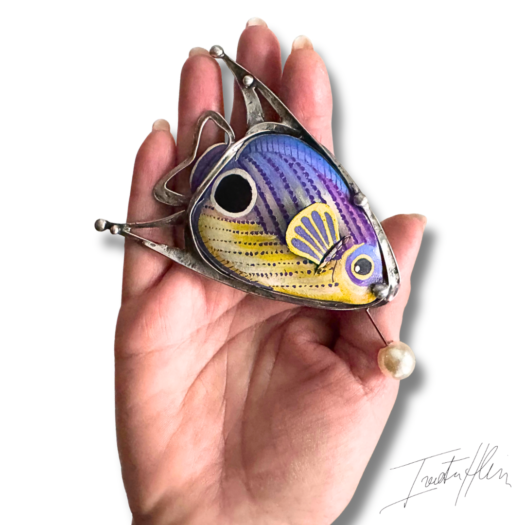 Originální brož z cínu, stříbra a ručně malované rybičky z kůže s 3D ploutví.