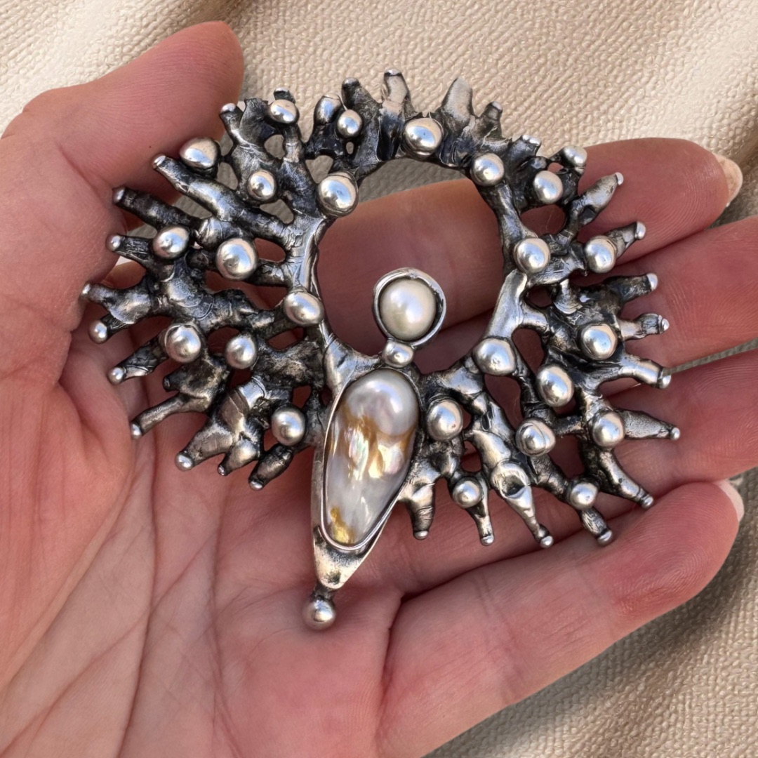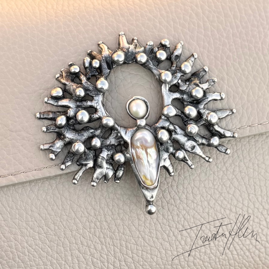 Každý kus je autorský originál, ručně zdobený cínovanou sponou se stříbrem, se vsazenou přírodní perletí a říční perlou.